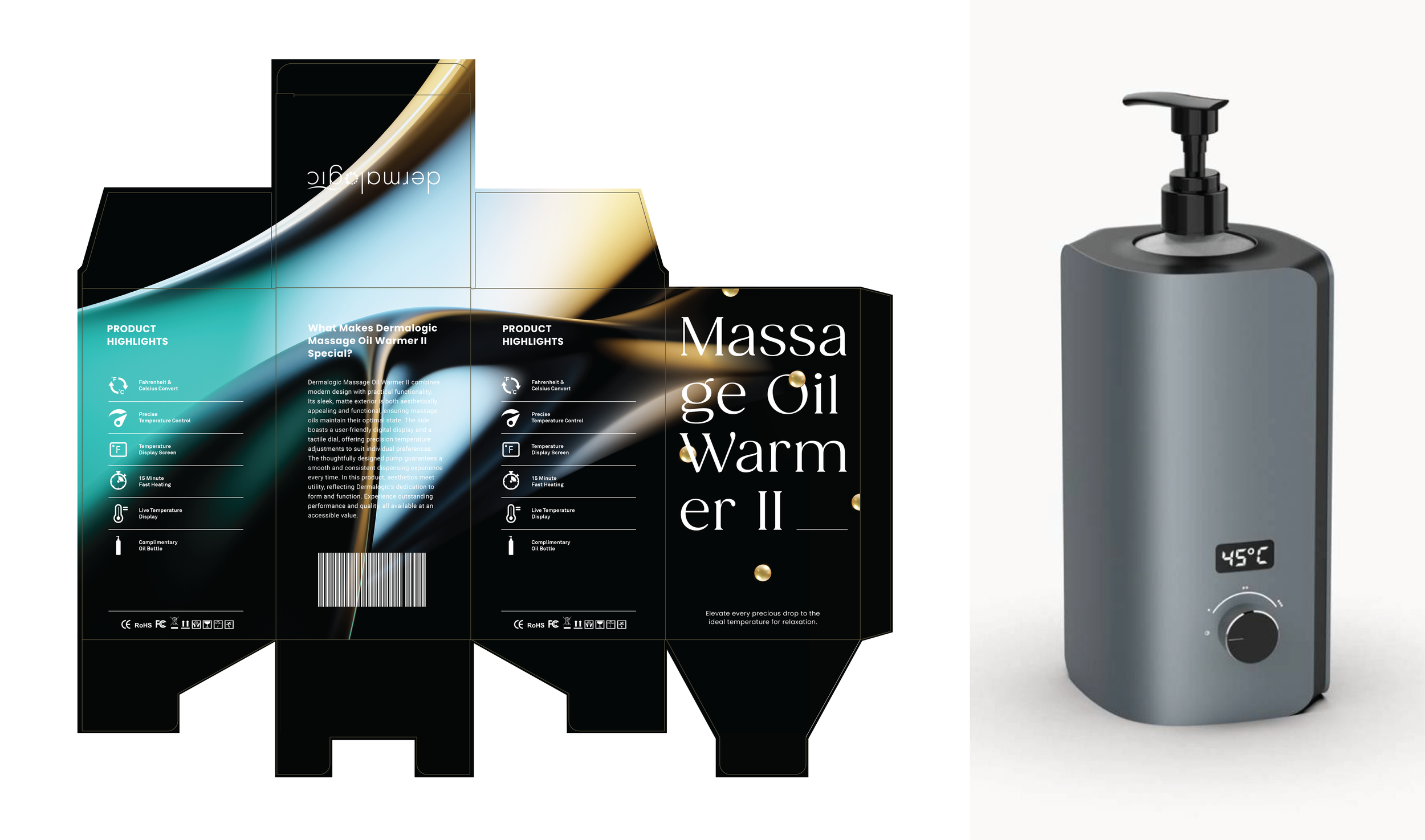 Packaging design for the Dermalogic Oil Warmer II, developed to support the product’s presentation through clear structure, refined visuals, and consistent brand execution.